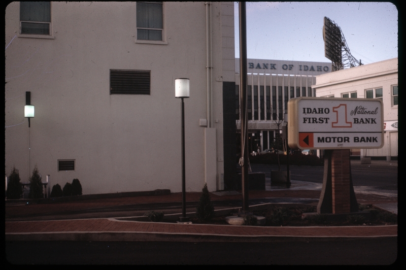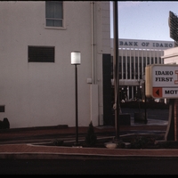 - View of entrance to Idaho First National Bank TV Drive-Thru (Motor Bank) teller lanes off of Shoshone Street; includes a view toward corner of Shoshone Street and Main Avenue; Bank of Idaho building in background