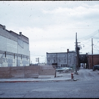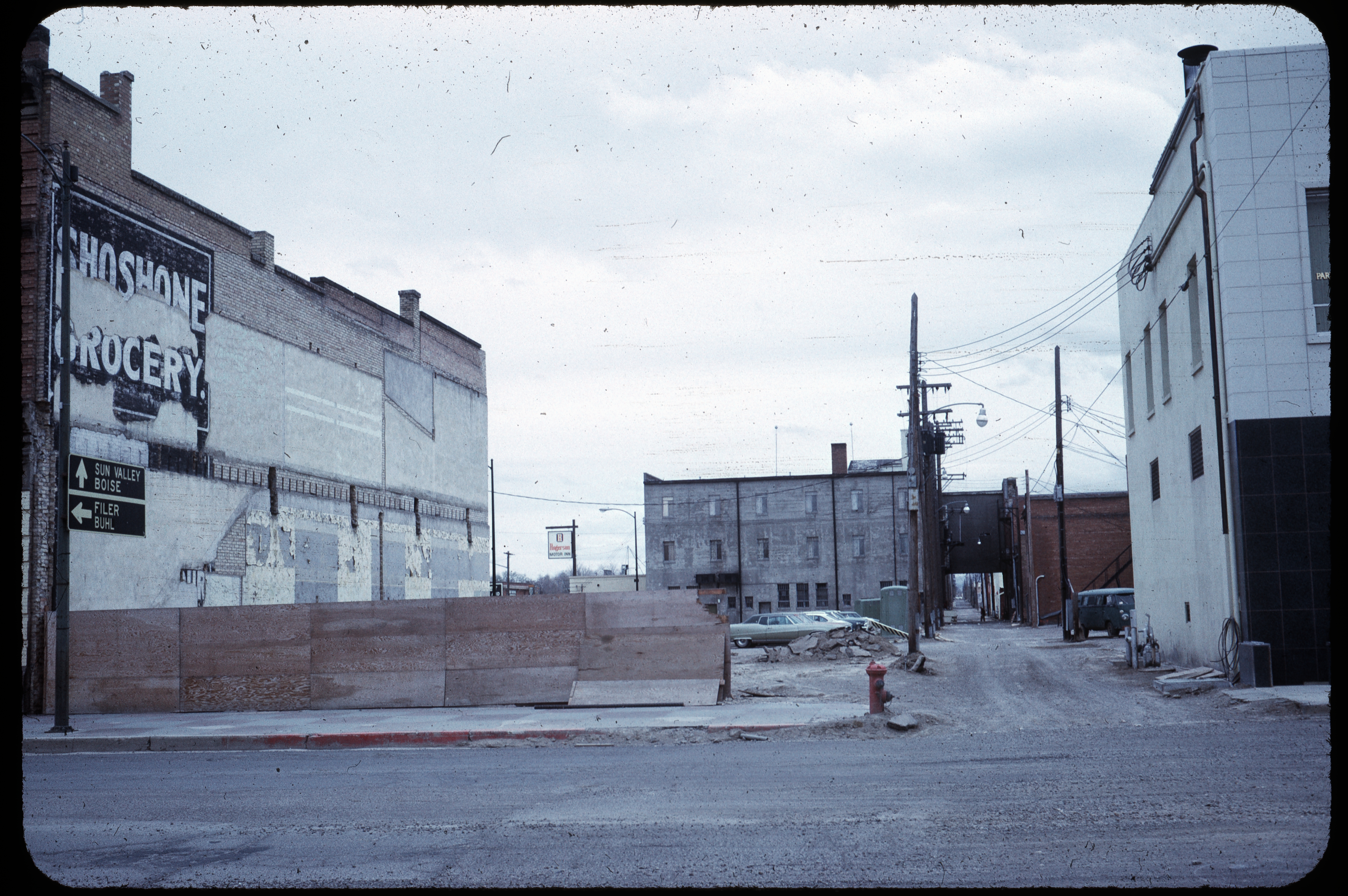 - View of entrance to Idaho First National Bank TV Drive-Thru (Motor Bank) teller lanes under construction; includes a view of the backs of some of the buildings on Main Avenue E and and 2nd Street E