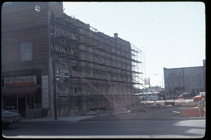- View of side of Burkholder building prior to the construction of the Idaho First National Bank TV Drive-Thru (Motor Bank) teller lanes; looking toward 2nd Street E