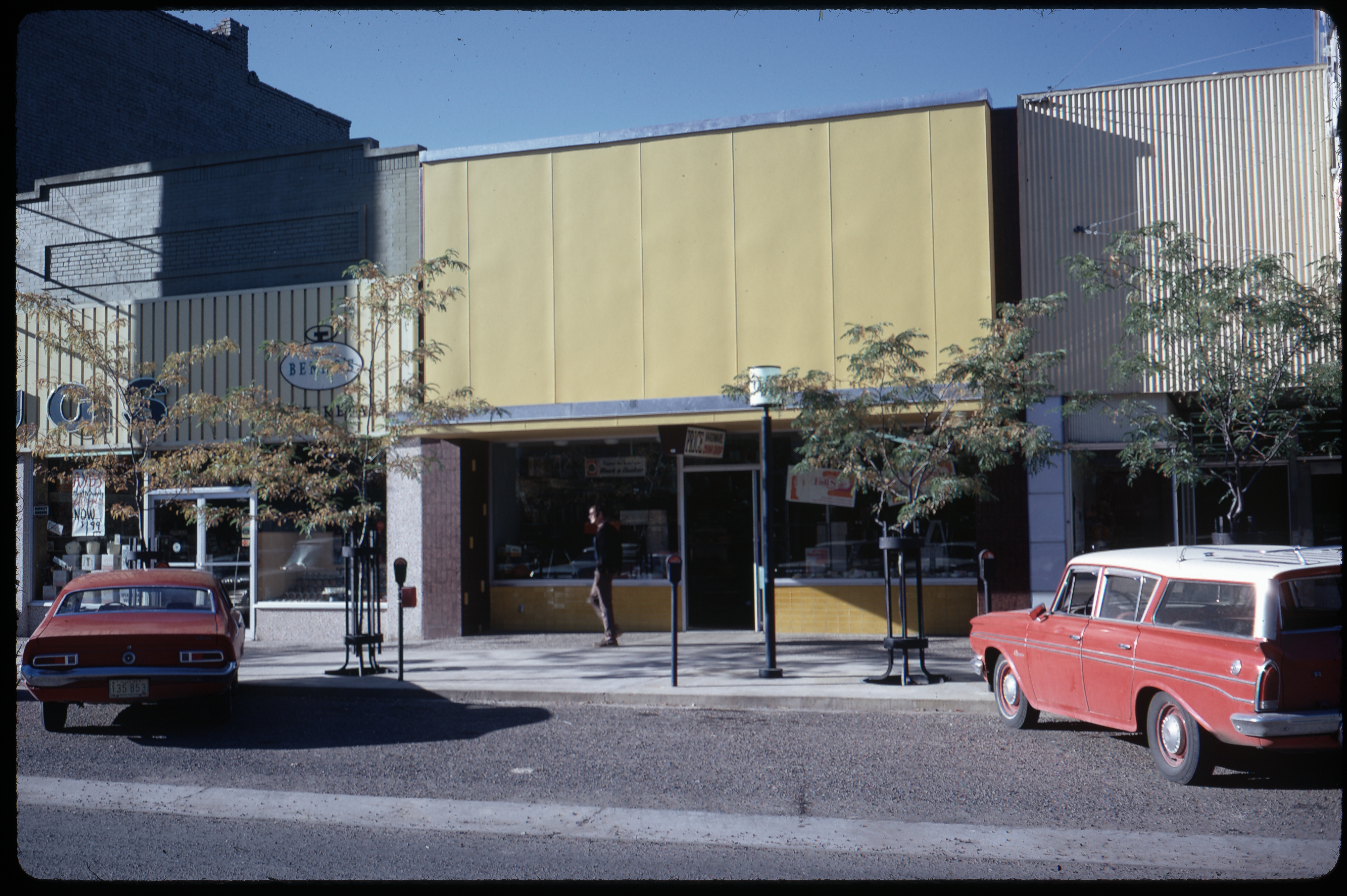 Price Hardware Storefront in yellow (now, Rudy's: A Cook's Paradise). Sav-More Drugs and Benno's to the left.