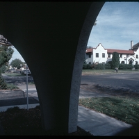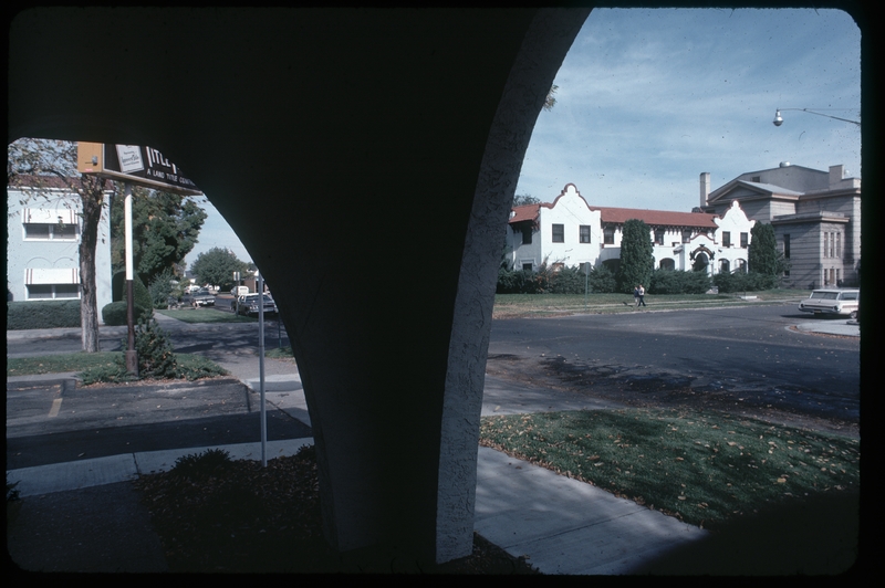 - View of corner of 3rd Avenue N and 2nd Street N, including the Justamere Inn, the Presbyterian Church, and the Belleville Apartment building, as seen through the arch of the Title Fact building.