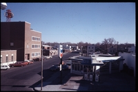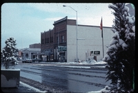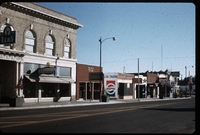 HG 712 Storefronts of buildings on Shoshone Street E. The white building at the left is the Twin Falls Title and Abstract building, which is across 2nd Street from the Burkholder building, which is next to the old Shoshone Grocery building. The entrance to the Idaho First National Bank Motor Bank is on the right. The tall building in the background is the Mountain Bell building.