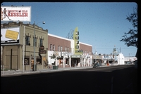 HG 715 Storefronts of buildings on Shoshone Street N, including the Log Tavern, The Clip Hair Styling for Men, the Twin Falls Chamber of Commerce, and the Massachusetts Mutual Life Insurance Co. (Dennis Ward and Associates). The Twin Falls County Court House can be seen on the very right. An advertisement for Pepsi can be seen on the alley side of the Log Tavern building .