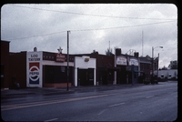 HG 716 Storefronts of Log Tavern Cocktails, The Clip Hair Styling for Men, and another building along Shoshone Street N. The alleyway at the side of the Log Tavern is also visible, as is a Pepsi advertisement for the Log Tavern.