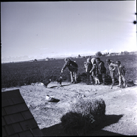 - Mrs. Cleo Shorthouse's kindergarten classes visit the Kenneth Walker farm. A group of children watch two geese inside a pen. A woman bends over the wire fence, feeding a goose. A metal bucket and a bale of hay are inside the pen. Fields stretch out into the distance.
