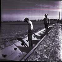 Peter Link Jr. and Lee McCoy look over a new type of irrigation system in a field on a farm south of Hansen. This system, the first of its kind in the area, is a concrete-lined ditch with plastic tubing for each corrugate set in the concrete. The farmers are wearing cowboy hats. Fields stretch out into the distance, and trees and houses line the horizon.