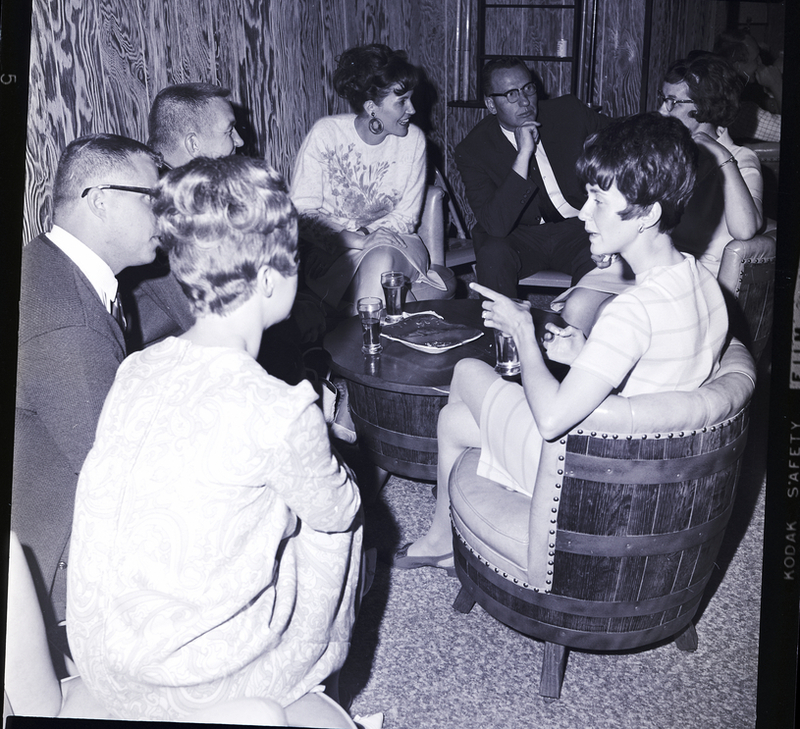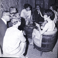 A group of people are gathered in chairs around a round table enjoying drinks at a Farewell Party for Merl Eden, held at the home of Tommy Walker. An ash tray, glasses, and napkins are on the table. Second from the left is Merl Eden, and third and fourth from the left are Mrs. and Mrs. Duke Wiseman.