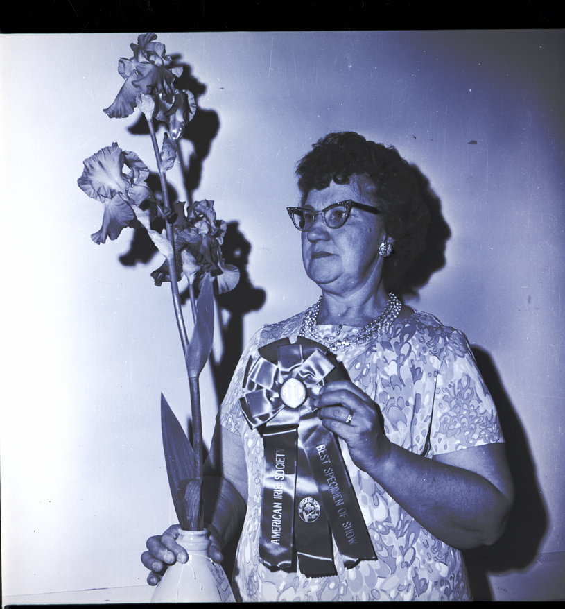 Mrs. Albert Toberer holds a vase of irises titled "Beth Corey" in one hand and a purple rosette award ribbon for best stalk that reads "American Iris Society Best Specimen of Show" in the other hand at an iris show sponsored by the Magic Valley Iris Society and held at the Twin Falls YMYWCA.