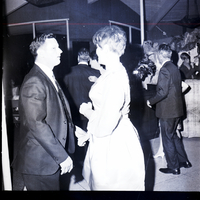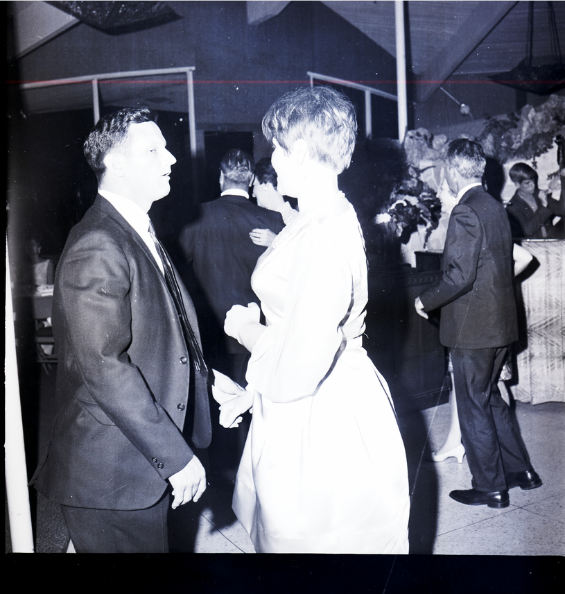 Couples dance at a formal dinner-dance held by the Welcome Wagon Newcomers Club at the Blue Lakes Country Club. The Rubaiyats are playing musical instruments in the background in front of a rock fireplace.