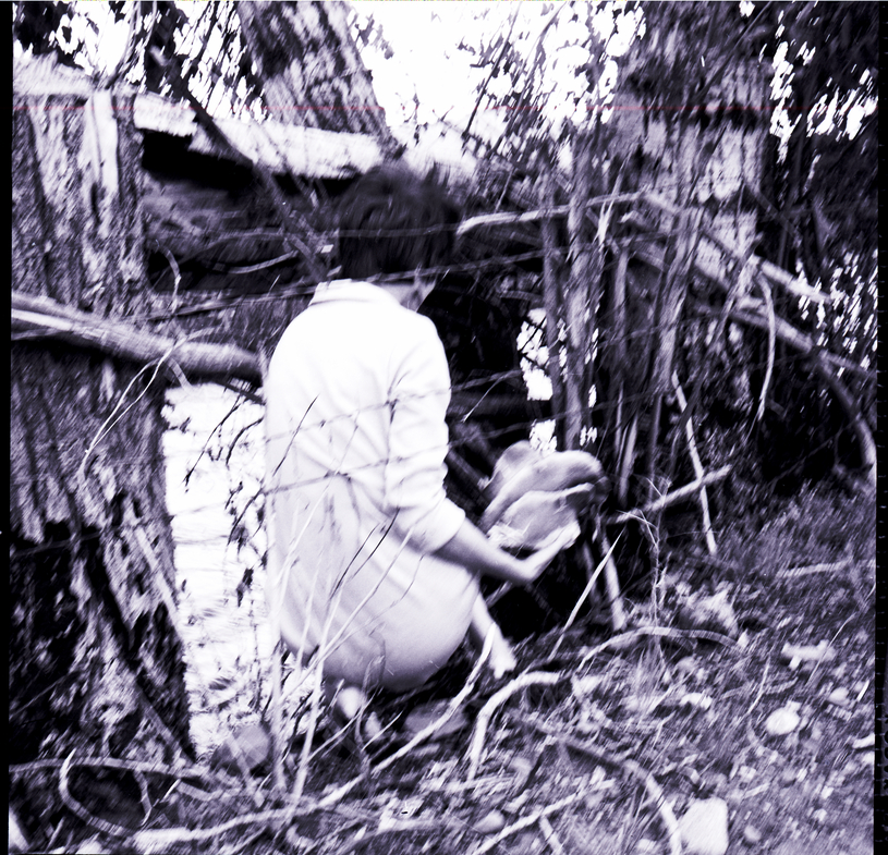 - A woman gathers some wild mushrooms near a collapsed tree. Beside her is a barbed wire fence.