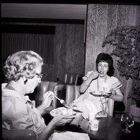 Two members of the Twin Falls County Democratic Women sit in chairs eating from plates of food at a potluck luncheon held in honor of Mrs. R.L. Summerfield at the home of Tommy Walker. Beside them is a round table, and on the table are some coffee cups and a clear goblet filled with water and floating flowers as a centerpiece. A small potted tree sits in the corner. Some empty chairs are scattered around the living room.