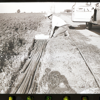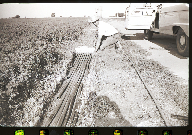 A farmer inspects some piping for a new irrigation system on a field near Jerome. He is dressed in a wide-brimmed hat. To the left a crop field stretches out into the distance. To the right, a truck is parked on a road with the front driver-side door open.