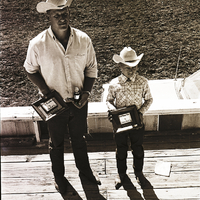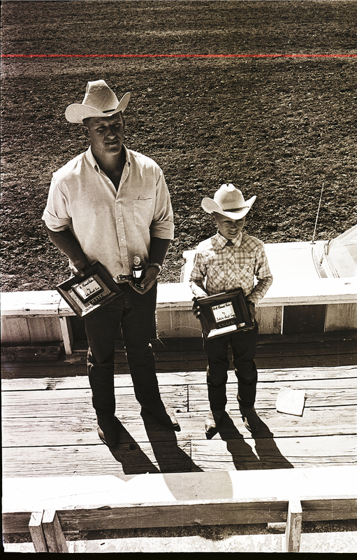 A man and a little boy dressed in cowboy hats and boots display some 4-H award plaques reading "4-H Round Robin by Idah-Best Inc. Winner" and a small trophy. A car is parked on the ground of the corral below the platform the man and boy are standing on.