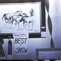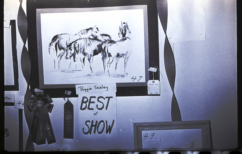An ink drawing of some horses by Peggie Seeley wins Best of Show at the Jerome County Fair. Several award ribbons hang off the drawing. Some streamers are hanging on the wall around the drawing.