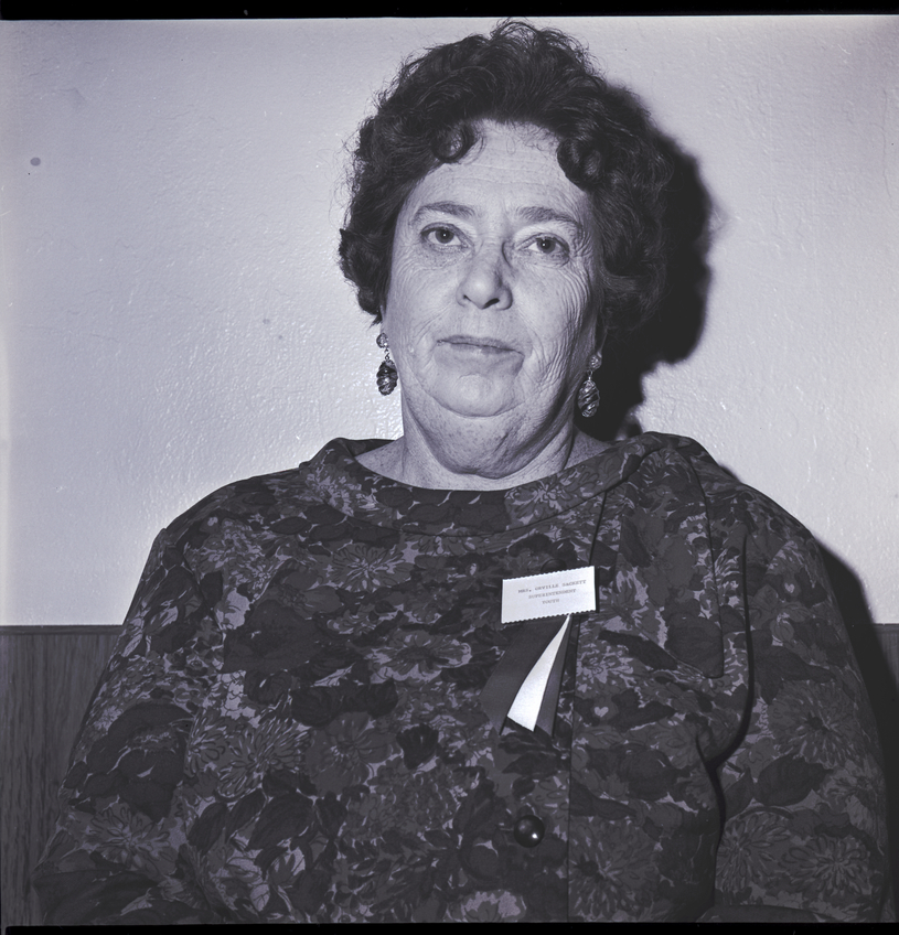 - Mrs. Orville Sackett, superintendent of youth for the Twin Falls County Fair, stands beside a wall. She is wearing a floral-print blouse with a name tag pinned onto the front.