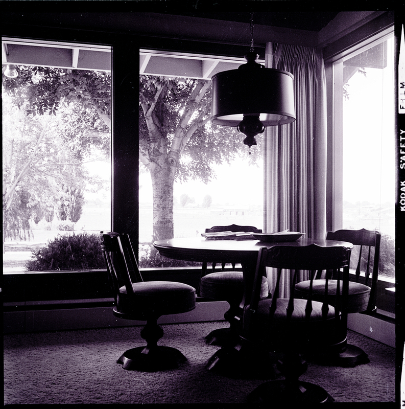 A wonderful view is seen from the dining room of the R. P. Parry. Mrs. John Rosholt is head hostess for the Junior Club at the Parry home for the upcoming Tour of Homes. In the dining room is a round table surrounded by four chairs. A ceiling lamp hangs above the table. Several trees and bushes are in seen in the yard through large windows.