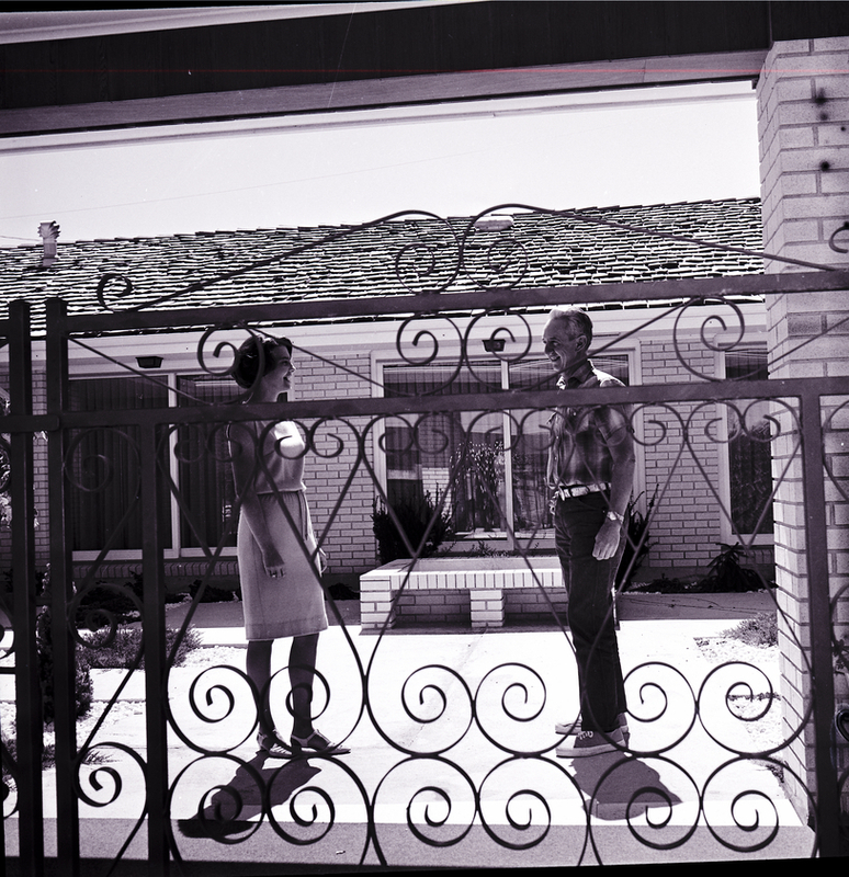 Wrought iron gates open onto the open courtyard at the home of Mr. and Mrs. Harry F. LeMoyne. Visiting in the courtyard with Mr. LeMoyne is Mrs. Jerry Meyerhoeffer, Junior Club hostess, who will head the tour at the LeMoyne home during the upcoming Tour of Homes. On the patio behind them is a fountain, and the side of the house is seen beyond it.
