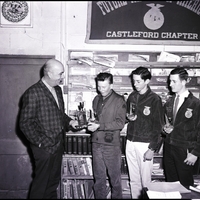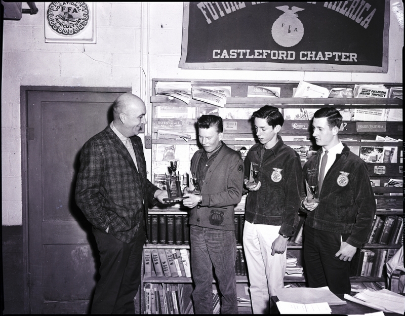 A first place team trophy is presented to the Castleford FFA team by Robert Carlson, representing Simplot Soilbuilders, left, at the South Magic Valley district FFA weed contest held in Castleford. FFA members are, from left to right, Devon Ruhter, Doral Brown, and Lowell Shaffer. Mr. Carlson is wearing a suit and tie, and the boys are wearing embroidered FFA jackets. A banner on the wall reads "Future Farmers of America Castleford Chapter" and a small plaque on the wall reads "Vocational FFA Agriculture."