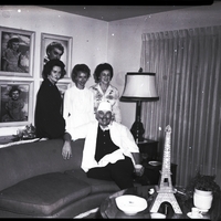 Mr. J. P. Seabeck, dressed in a Turkish fez hat, lounges on a couch at a bon voyage party held in honor of the Coiners before their trip to Europe. From left to right, Mrs. Jerome Wilson, Mrs. George Coiner, and Mrs. J. P. Seabeck stand behind the couch. A scale model of the Eiffel Tower sits on the table as a decoration.