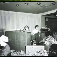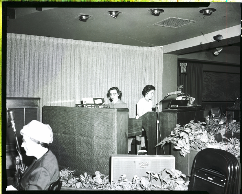 Mrs. Kenneth Shew, left, plays the piano and Mrs. Mary White, right, plays an organ for a group of people at the Twin Falls Federated Music Club's 14th annual White breakfast. They played three all American piano and organ arrangements, "On the Trail" from the "Grand Canyon Suite" by Grofe, "Indian Love Call" by Friml, and "Ragging the Scale" by Claypoole. Flowers decorate the room.