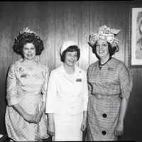 Attending the Welcome Wagon Newcomers Club April Fool's Day hat revue are, from left to right, Mrs. L. J. Robertson, president, Mrs. L. E. Hinton, Welcome Wagon hostess, and Mrs. Richard Dixon, out-going treasurer. Mrs. Robertson, dressed in a polka dot dress, wears a hat of black crepe paper with white signs sticking out of it reading "Pharmacy," "Bank & Trust," "Oil Co.," and "Texaco." Mrs. Hinton is dressed in a plaid dress suit and white bonnet. Mrs. Dixon, dressed in a striped dress, wears a hat covered in fake paper money and various bills and invoices. They are standing beside a table that has some ashtrays, paper, and a wallet on it. On the wall behind them hangs a painting of a clown.