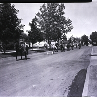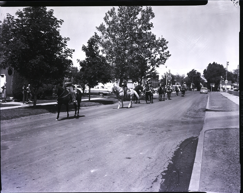 A procession of women on horses, dressed in cowboy hats and boots, ride down a street in the Magic Valley Western Horse Show Parade. Some people stand on the sidewalk watching. A rider holding a white flag and a rider holding an American flag ride down the intersecting street. Houses, autombiles (cars), street signs, and signs reading "76" and "Free Parking Safeway" are in the background. Several trees line the streets.