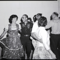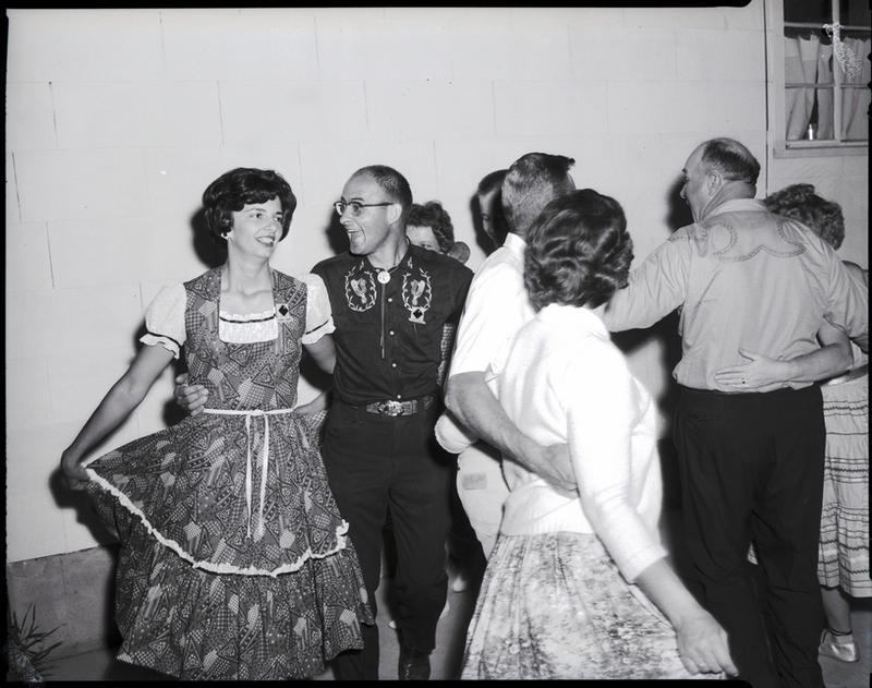 Four men and four women in full skirts square dance outside together prior to the Idaho State Square Dance Festival. The name tag of the woman on the left reads "Corrine Thiebery."