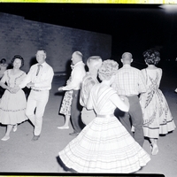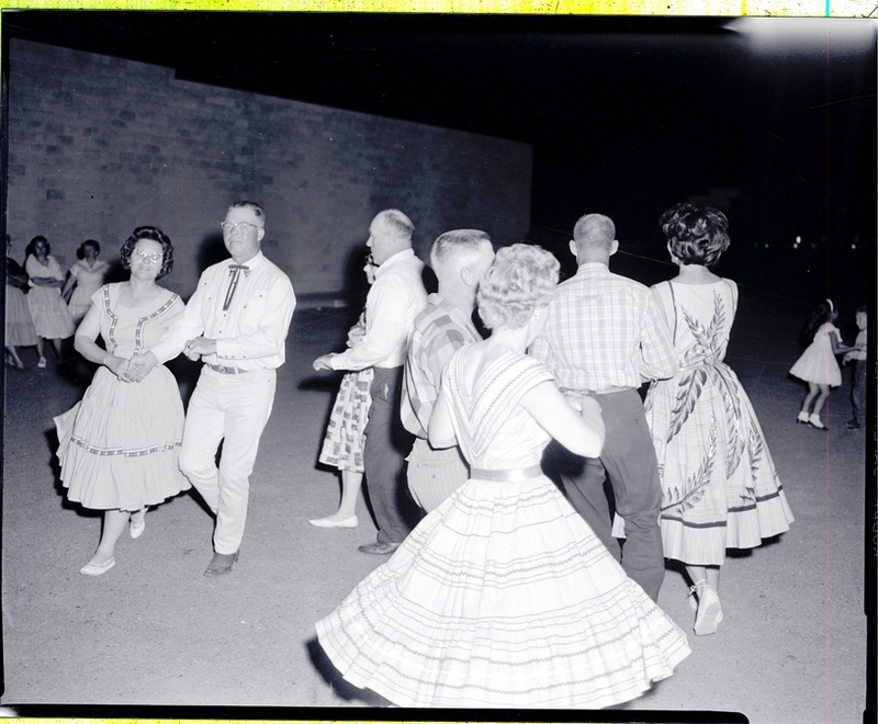 Four men and four women in full skirts square dance outside together prior to the Idaho State Square Dance Festival. A group of three woman stand on the sidelines watching. A little girl and little boy dance together to the right, behind the square dancers.