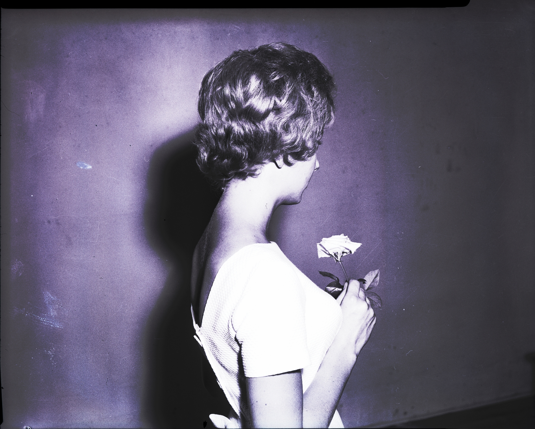 - Diana Drake, dressed in a white dress and holding a rose, shows off her short curly hairstyle from a profile view.