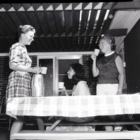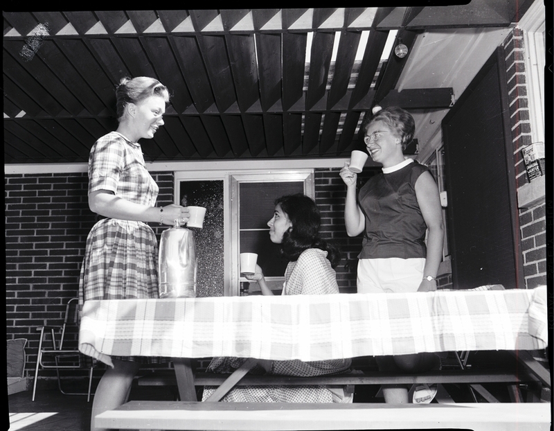 Three international Ambassadors for Friendship sit on a porch drinking coffee during a visit to Twin Falls sponsored by the Altrusa Club. From left to right are Barbara Jean Burns, Sweera Chaturvedi, and Francoise Mansion. Ms. Chaturvedi is dressed in an Indian sari. The picnic table is covered in a table cloth, and a tall tea pot sits on top of it. The brick house is in the background.