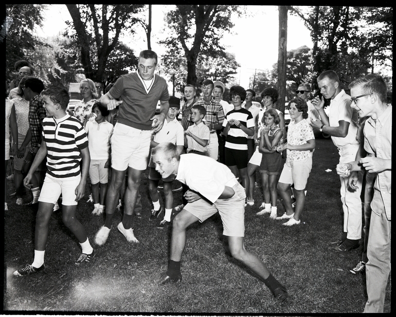 Ken Masoner, son of Mr. and Mrs. Elwood Masoner, competes in an egg-throwing contest at the 18th Annual BPOE picnic. A man in a v-neck shirt and shorts and a boy in a striped shirt and shorts are to the side. Around them is a group of people watching. In the background behind the gathering of men, women, and children, the trees of the fairground and some parked automobiles (cars) and houses are visible.