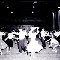 A group of square dancers dance in the Twin Falls High School gymnasium at the Idaho State Square Dance Festival. The women are dressed in full skirts. Behind the group of dancers is a large banner reading "Howdy you are all square dancers."