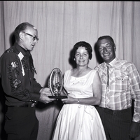 Ernie Davis presents the out-of-state trophy to Mr. and Mrs. Robert Bliss from Encino, Califorina, at the Idaho State Square Dance Festival held at Twin Falls High School. Mr. Davis is wearing a name tag reading "Ernie Davis, Twin Falls, Idaho," and an award ribbon reading "Formation." Mrs. Bliss is wearing a white dress with a full skirt and a name tag that reads "Rosemary Bliss, Los Angeles, California." Mr. Bliss is wearing a plaid shirt and striped pants. The trophy reads "1st Idaho State Square Dance Festival, Largest Out of State Area Attending, July 31 - Aug 1-2, 1964, Twin Falls, Idaho."