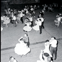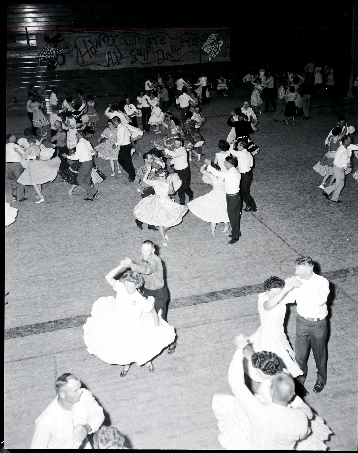 A group of people square dance in the Twin Falls High School gymnasium at a the Idaho State Square Dance Festival. The women are dressed in full skirts. Behind the group of dancers is a large banner reading "Howdy you are all square dancers."