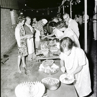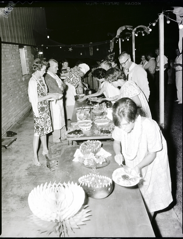 A group of people stand in line for a potluck dinner at Mrs. Charles Hopkins Hawaiian luau in honor of six members of the Experiment in International Living. Several bowls of salads and plates of food are spread on the table, and the guests help themselves to the buffet. They are all wearing leis around their necks. A string of lights and paper stars hang as decoration above the table. The side of the house and the fence around the backyard are in the background.