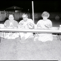 From left to right, Mrs. Richard High, Lawrence Gould, and Probate Judge Zoe Ann Warberg sit on the ground at a low table eating dinner at Mrs. Charles Hopkins Hawaiian luau in honor of six members of the Experiment in International Living. They all wear leis around their necks. Pine trees, tiki torches, the fence around the backyard, and a gazebo next door are in the background.