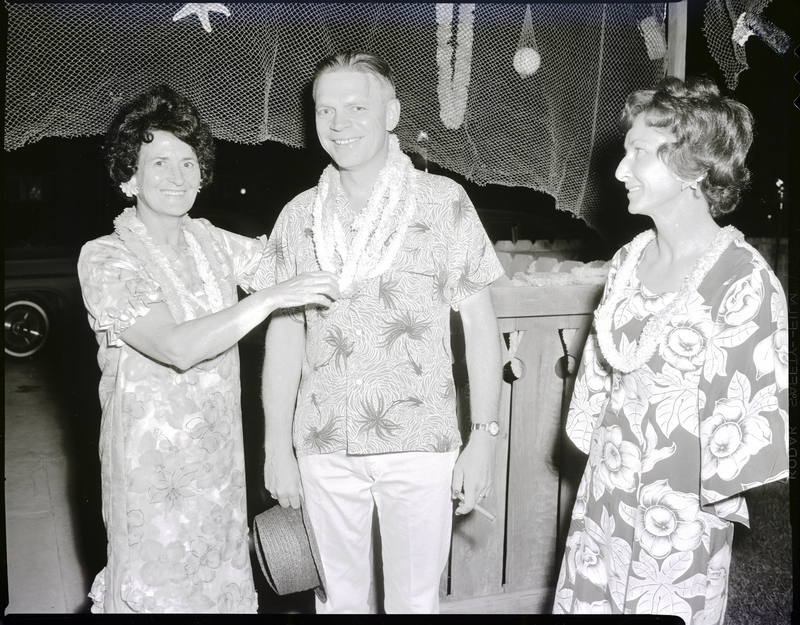 Mrs. Charles Hopkins, left, presents Ivan Skinner with a lei at her Hawaiian luau in honor of six members of the Experiment in International Living. Mr. Skinner is chairman of the group of local citizens working with the Experiment program. Mrs. Ivan Skinner, right, watches. They are all dressed in floral print clothes with leis around their necks. Behind them, some netting with hanging leis and starfish is used as decoration. The fence around the yard and a parked automobile (car) are in the background.