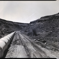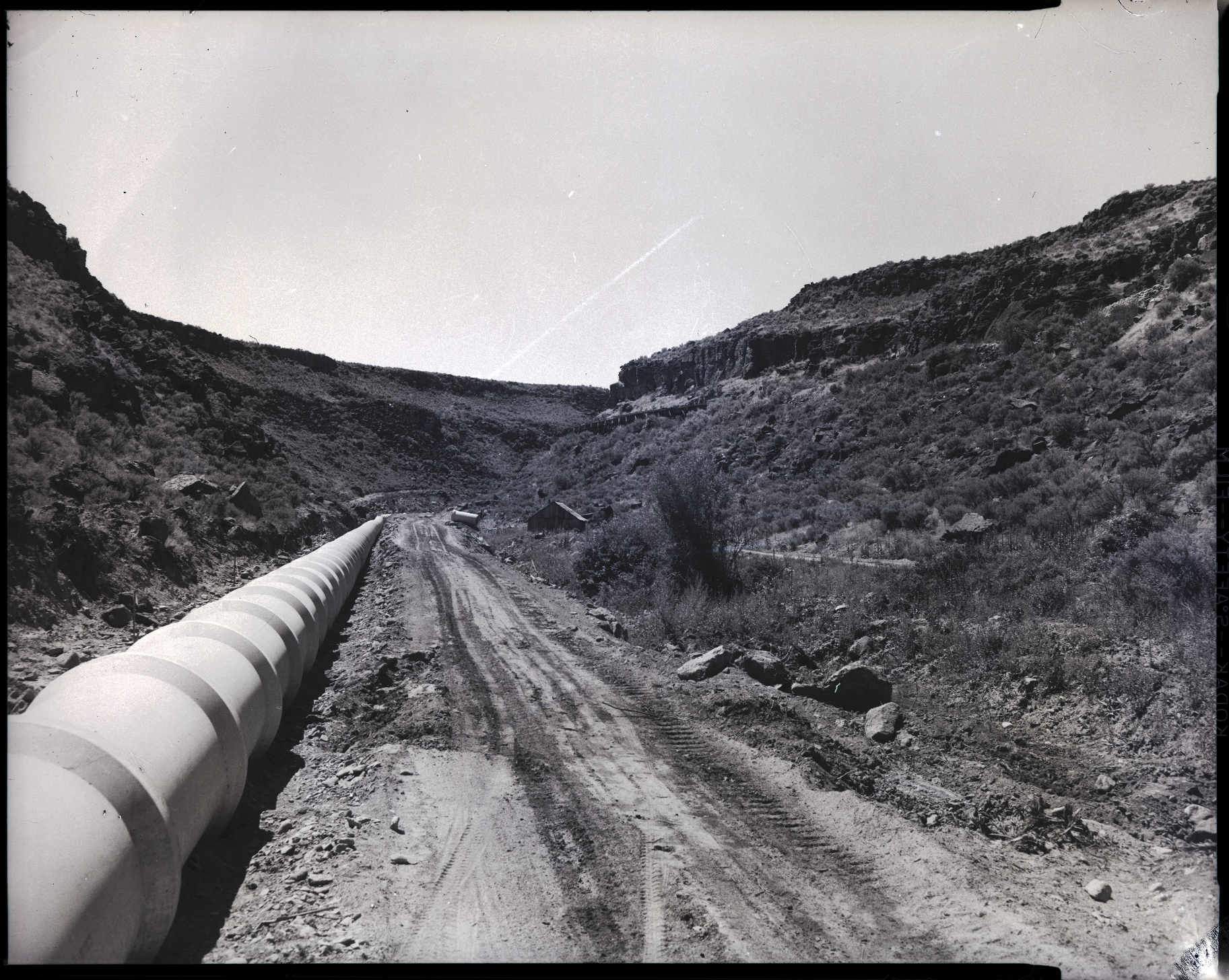 - The large funnel of the Roseworth flume stretches through the desert landscape near Roseworth, Idaho. A dirt road for vehicles runs parallel to the flume. A small wooden hut is to the side of the road. Rocks, shrubs, and sage brush cover the landscape.