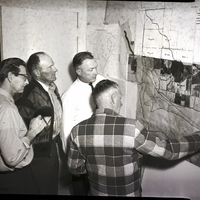 Proposed new canal alignment is discussed at the Twin Falls Soil Conservation district board of supervisors meeting. From left to right are Forest Clousner, area conservationist, Thurman Clark, Roseworth tract supervisor, Lee Morgan, state conservationist, and Lawrence Sill, Roseworth tract supervisor. Behind the men is a map broken into quadrants and labeled with the names "Bryant," "Olson," "Davis," "Sill," and "Arness." The legend in the corner of the map says "Present System," "Present take-out," "Proposed ditch," "Proposed take-out," and "Proposed concrete ditch."
