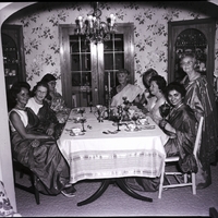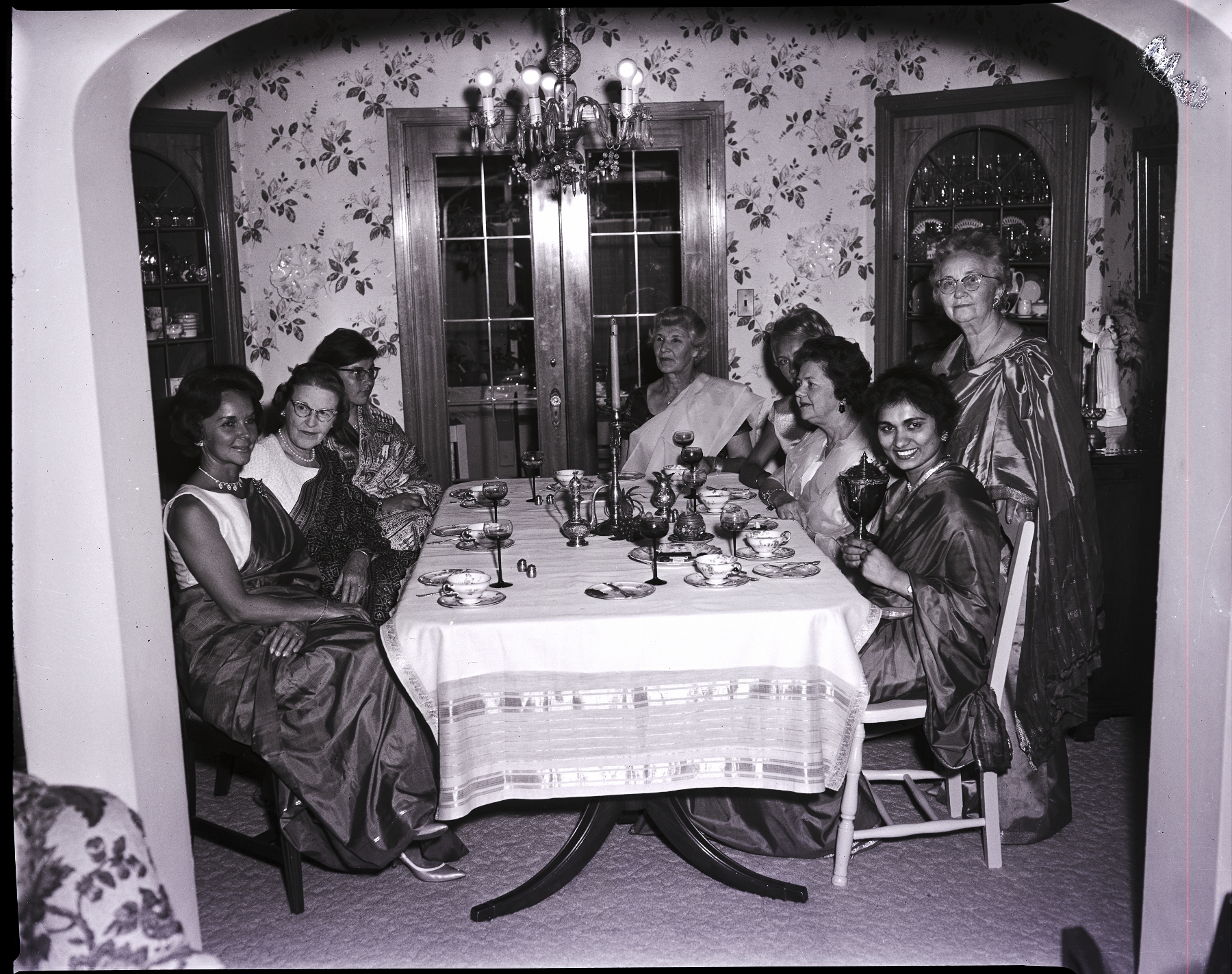 Guests dressed in Indian saris are shown conversing around a dining table at Mrs. Marjorie Hawes India party. From left to right are Mrs. Lowell Elam, Mrs. J. W. Banbury, Roswitha Leusner, Mrs. Peter Link, Mrs. George Coiner, Mrs. Claude Detweiler, Mrs. Marjorie Hawes (standing), and Mrs. Surjit Kaur. On the table are tea cups, saucers, spoons, and wine glasses. In the center of the table is an Indian teapot and jug, next to a centerpiece of grapes, pineapple, and a candle holder. A chandelier hangs above the table. Cabinets of china and a glass door showing outside are in the background.