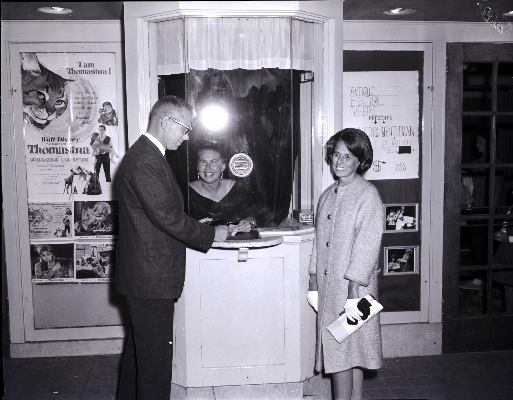 Mr. and Mrs. Robert Tullis stand outside the Ramona Theater ticket booth to see the "Bourgeois Gentleman" play in Buhl. Mrs. Aldrich Bowler sits inside the booth, and hands Mr. Tullis a ticket. The posters to the sides of the booth read "Walt Disney's Thomasina" and "Antique Festival Theatre Presents Bourgeois Gentleman by Moliere." Some people can be seen inside the theater through a window.