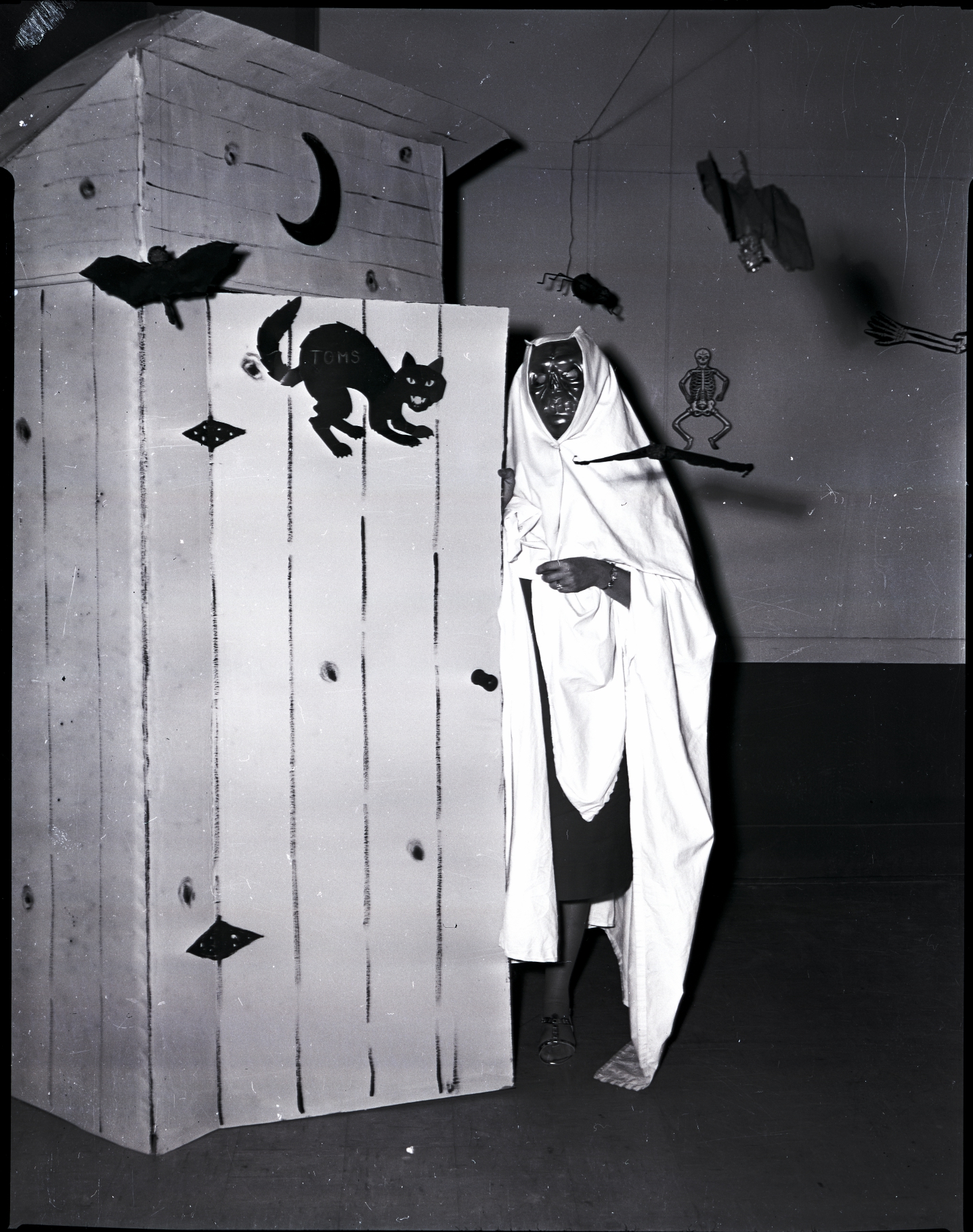 A woman dressed up in a demonic mask and a white shroud stands beside a cardboard outhouse at the Newcomers Couples Club Halloween Party held at the Rogerson Hotel. The cardboard outhouse is decorated with cut outs of a black cat that has "Toms" written on its side, a bat, and a moon. Spider and bat decorations hang from the ceiling. Skeleton decorations are on the wall in the background.