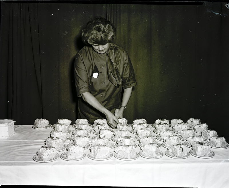 Mrs. L. J. Robertson, president of the Newcomers Couples Club, serves huge slices of pie decorated with plastic bugs at the Newcomers Couples Club Halloween Party held at the Rogerson Hotel. A stack of napkins sits on the table next to the plates of pie. She is wearing a dress with a witch pin on the front.