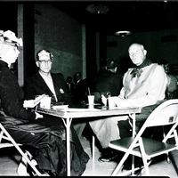 From left to right, Mrs. R. B. Lemmon, R. B. Lemmon, and Bernard Schmidt sit at a card table in folding chairs and play Bridge at the Newcomers Couples Club Halloween Party held at the Rogerson Hotel. They are dressed in crazy costumes. Some cups sit on the table. Other people sit at tables visiting in the background.