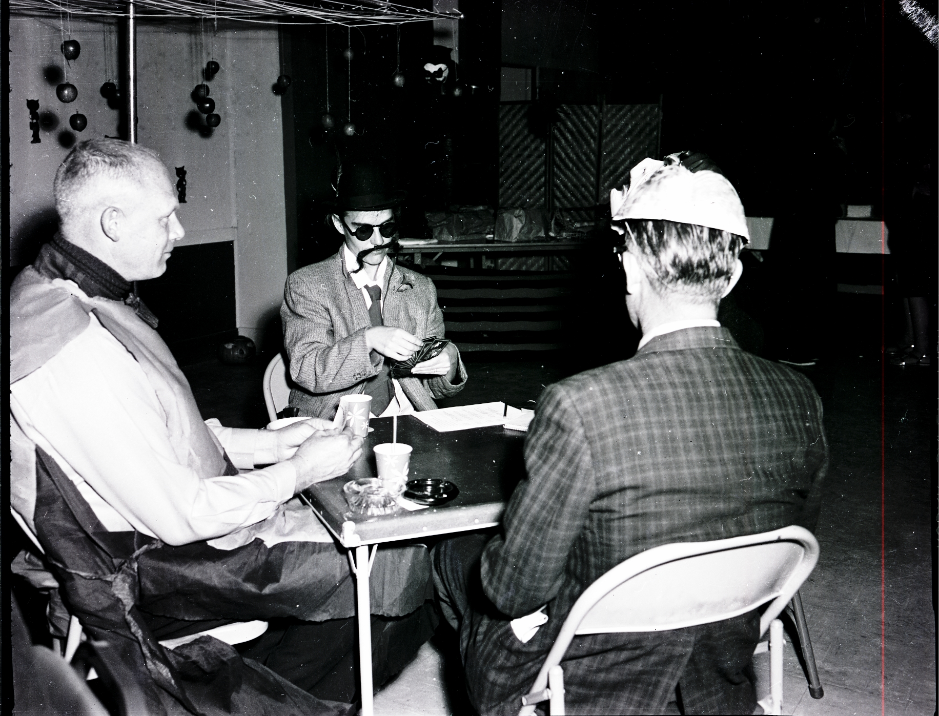 From left to right, Bernard Schmidt, Mrs. Paul Wetter, and R. B. Lemmon sit at a card table in folding chairs and play Bridge at the Newcomers Couples Club Halloween Party held at the Rogerson Hotel. They are dressed in crazy costumes. Some cups and ashtrays sit on the table. Apples hanging on strings from the ceiling are in the background.