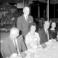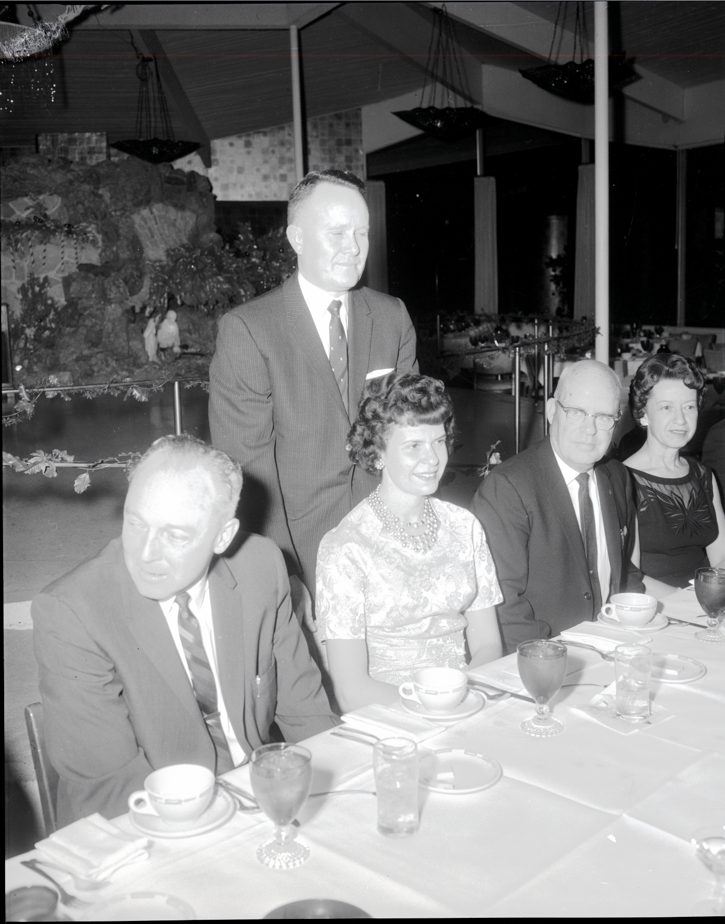 A group of city officials are seated at a large dining table at a Christmas party at the Blue Lakes Country Club. Standing is Commissioner C. E. McIntyre, who assists Mrs. McIntyre into her chair. Seated to her right is commissioner John Flatt. The table is covered in a white table cloth, and on the table are tea pots, tea cups, saucers, silverware, glasses, wine glasses, and napkins. In the background, behind a banister covered in Christmas decorations, is a rock fireplace. Candy canes hang off the sculpture, and a nativity set is placed underneath an overhang in the rock face. The three men are wearing suits and ties and the two women are wearing dresses.