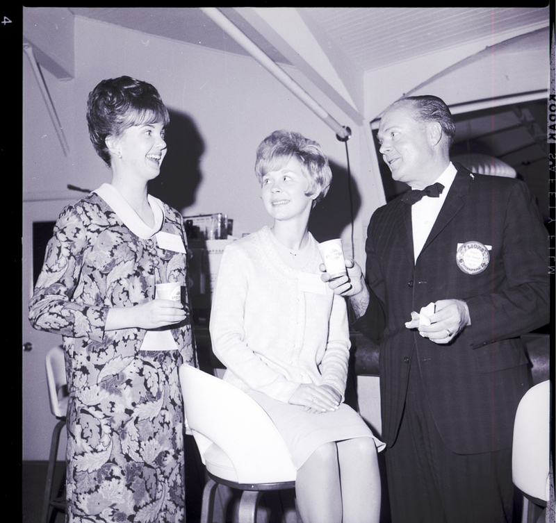 Chatting with Dale Henman, right, are Peggy Scott, left, and Sandra Simmons at a recent social at the Blue Lakes Country Club hosted for girls interested in becoming contestants in the Miss Twin Falls Pageant. Mr. Henman, dressed in a a suit and bow tie and Lions International badge and holding a cup and donut, is the entries chairman for the pageant, which is sponsored by the Twin Falls Lions Club. The women have curled hair and are wearing dresses and name tags.