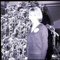 Cheryl Couch, the reigning Miss Twin Falls, was a featured speaker at a social to acquaint prospective contestants for the Miss Twin Falls Pageant, held at the Blue Lakes Country Club. She will represent Twin Falls County and the Twin Falls Lions Club in the Miss Idaho Pageant in June. She is dressed in a V-neck shirt and skirt and stands in front of a large Christmas tree. The tree is decorated in tinsel and bulbs.