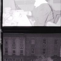 In the top photo, chatting during lunch at the Hotel Boise are, from left to right, Mrs. Norma Herzinger and Senator Mary Brooks. Various food items are on the table. In the background, some curtains blow in the breeze, and a potted plant sits on a window sill. A building can be seen outside the window. In the bottom photo, the Hotel Boise is seen from the outside. Some people are on the steps of the building, and some automobiles (cars) are parked along the street. Several trees and bushes are on the lawn. Snow covers the ground, trees, and cars.