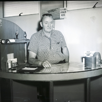 Ken Roundy, president of the Twin Falls Motel association and owner of the Deluxe Motor Lodge, supports a water bond for the growth of Twin Falls. He stands behind a desk, and on the desk is a clipboard with a registration form, an ashtray, a "Ring Bell for Service" sign, and a can with a sign above it that says "Help Yourself." Behind him a picture of an airplane hangs on the wall, and a sign beside it reads "Flying Spoken Here."